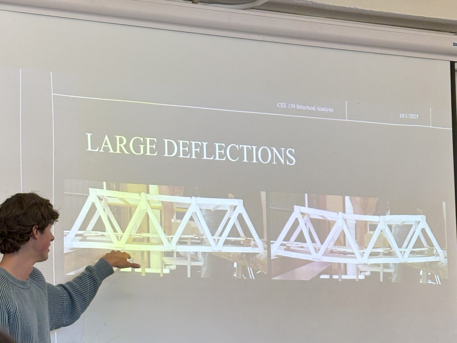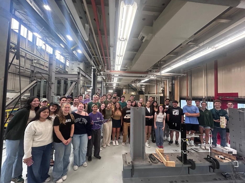 This was the scenario faced by the 45 students in Assistant Professor of Civil and Environmental Engineering and Environment Professor Claudia Reis’s CEE159 class at Lehigh University early in the fall 2025 semester. Eight teams spent three weeks planning, research, designing, and constructing some form of truss bridge. At the end, teams submitted their final build to testing at the ATLSS (Advanced Technology for Large Structural Systems) Engineering Research Center, where an actuator was used to test the bridge’s capacity to carry an increasing displacement. The bridge was instrumented to monitor and record the concentrated load.